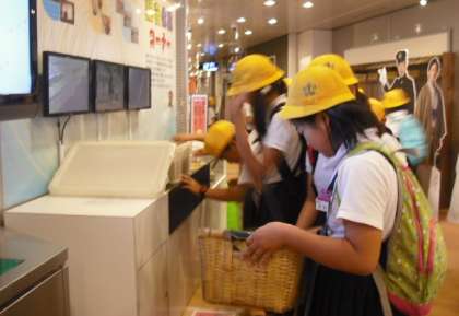 まず、NHK大阪放送局のBKプラザというところへ行きました。そこで、案内の人から、放送に関するいろいろな説明を聞いたり、セット用の瓦やマンホールの実物を触ったり、波などの効果音を出す体験をしたりしました。