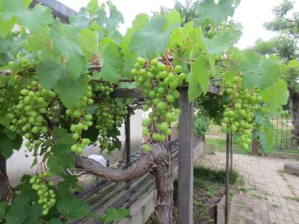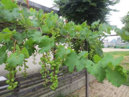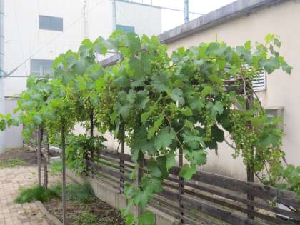 今年はとてもたくさんのブドウが実っています。植えてから5年目で幹も太くなり、秋の収穫が楽しみです。でも甘くなったころには、たくさんの鳥たちがやって来ます。