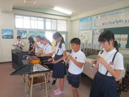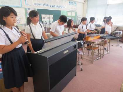 ♪リボンのおどり♪ 課題「パートを重ね方を工夫しよう」グループごと話し合って担当を決め、協力し合って発表しています。