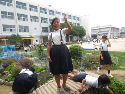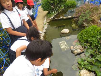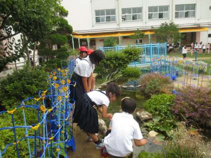 滝から池まで小川が流れています。この小川にはウチワゼニグサ・ウォータークローバー・スイレン・フトイなどの水生植物が茂り、ヒメダカ・ドジョウ・タニシ・ヤゴなどが暮らしています。子どもたちは、生まれたばかりのヒメダカの子どもをさがしていました。