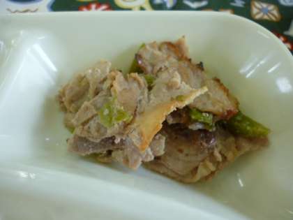 豚肉、ピーマンに砂糖、料理酒、こい口しょうゆ、梅肉で下味をつけ焼いています。