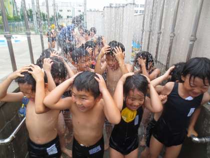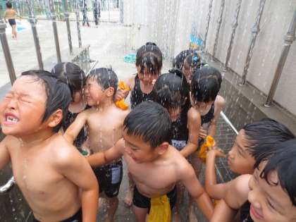 最初のプール水泳です。今日はプールの入り方をしっかりと覚えました。プールでは水かけや顔つけをして、まず水に慣れることをしました。どの子も大喜びでしたが・・・声が出すぎていて・・・少し注意されていました。次のプール水泳からは、2年生と一緒に入ります。