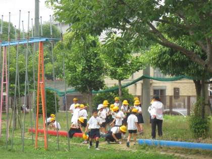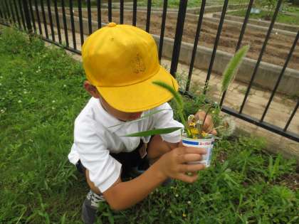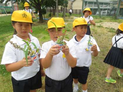 「雑草アート」作りのため、校庭にでて草や草花をさがしています。一人一人がヨーグルトのカップに雑草をいけて、「雑草アート」をつくりあげていました。草木に目を向けることで校庭の自然に気づき、子どもたちはウキウキと楽しく活動していました。