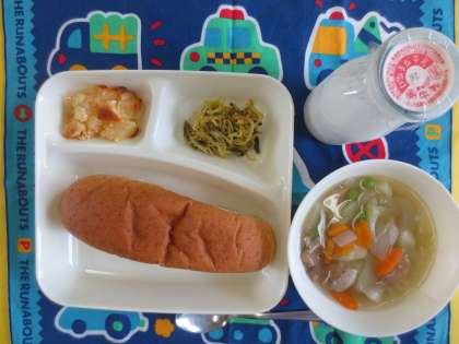 鶏肉と野菜のスープ煮、カレーソテー、りんごのクラフティ、ライ麦パン、牛乳