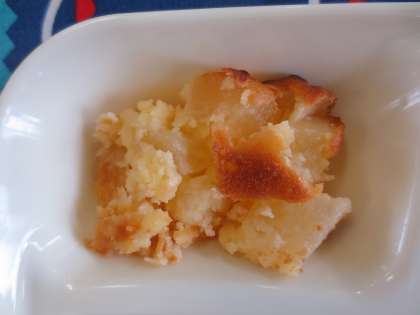 小麦粉、卵、クリーム、砂糖にりんご缶を加え、コーンフレークを敷き詰めたミニバットに流し入れて焼きます。