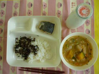 さごしの塩焼き、みそ汁、牛ひじきそぼろ、ご飯、牛乳