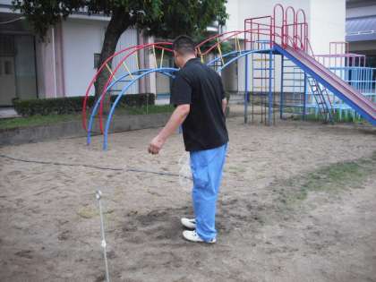 目砂の上から水をまき、9月まで養生するために、周りにロープを張りました。
