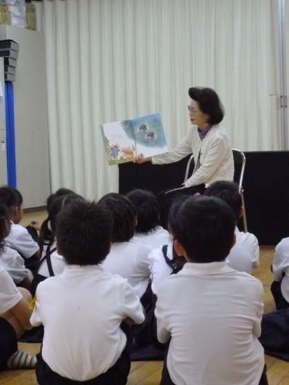 生野図書館の「あじさいブッククラブ」の方々による「おななし会」がありました。用意してくださった絵本や紙芝居などの読み聞かせ会です。