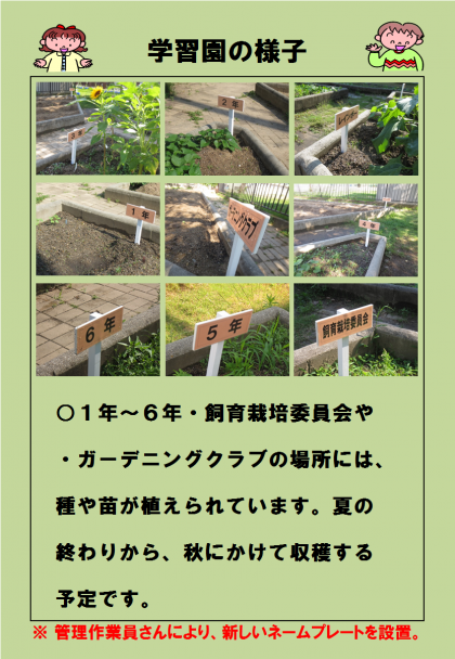 1年〜6年・飼育栽培委員会・ガーデニングクラブの場所には、種や苗が植えられています。夏の終わりから、秋にかけて収穫する予定です。※ 管理作業員さんにより、新しいネームプレートを設置しました。