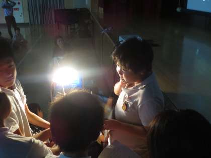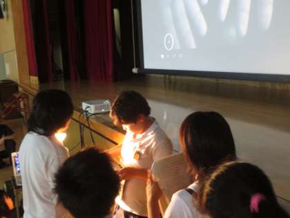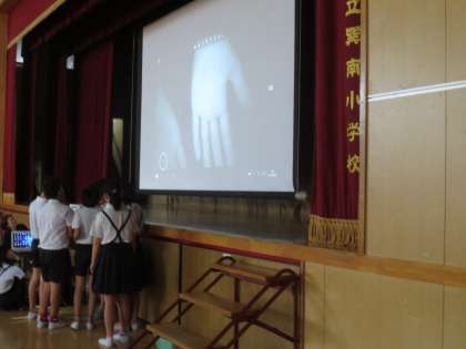 お友だちの手をタブレットのカメラで撮り、スクリーンに映し出しています。どうすれば汚れた手がきれいになるのか・・・お友だちが手を洗いに水道のところへ・・・お友だちが手を洗って戻ってきました。手はとてもきれいになっています。