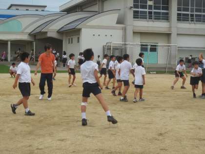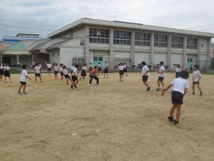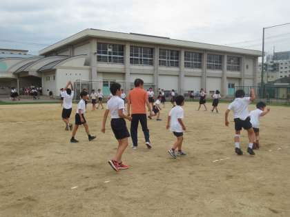 運動場でドッジボールをしている子どもたちです。先生も一緒にやっています。