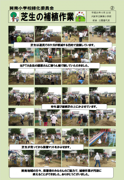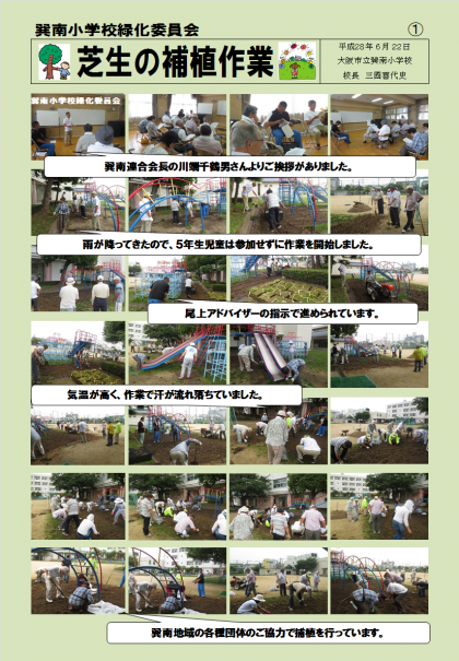 運動場の緑化事業を地域の方々にご協力をいただき取り組んでいます。特に遊具の下には芝生を育て、ゲガの軽減・運動意欲の向上・熱中症対策等に役立てています。今年も傷んだ芝生の補植作業にご協力をいただきました。巽南連合会長の川端千鶴男さんをはじめ多くの地域の方々や保護者の方々にご参加いただきました。ありがとうございました。当日の様子を載せております。ご覧ください。