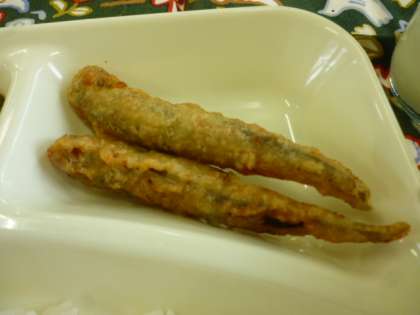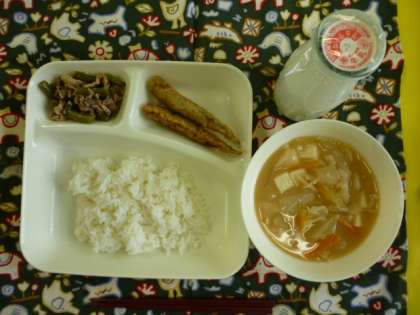 いわしてんぷら、みそ汁、豚肉と三度豆のいためもの、ご飯、牛乳