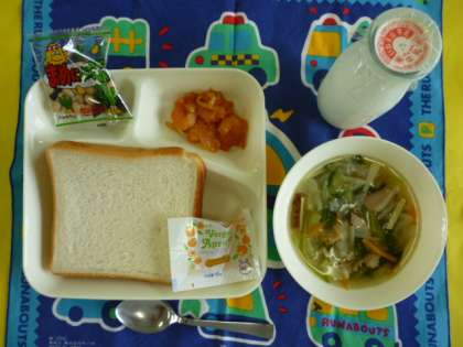 えびのチリソース、中華スープ、豆こんぶ、食パン、アプリコットジャム、牛乳