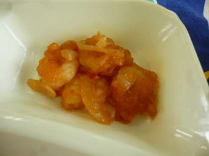 えびに下味をつけ、油であげ、砂糖、トウバンジャン、こい口しょうゆ、ケチャップで味つけします。
