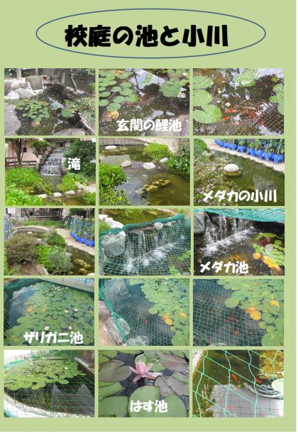 玄関の池にはコイがいます。滝は小川を下りメダカ池に流れ込んでいます。メダカ・ドジョウ・ヤゴ・タニシ・キンギョなどがいます。ザリガニ池にはアメリカザリガニ・コイ・オイカワ・キンギョなどがいます。保健室裏のはす池には、オイカワ・フナ・キンギョなどがいます。いつも飼育栽培委員会の児童たちが、下校時に「食事」の世話をしてくれています。春の頃からはかなり大きくなっています。