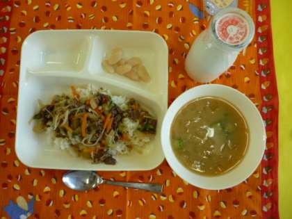 牛丼、とうがんのみそ汁、大福豆の煮もの、牛乳