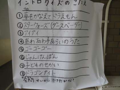 昨日の「イントロゲーム」のこたえです。さあっ何問正解でしたか。次回の縦割り集会もきっと楽しいですよ。