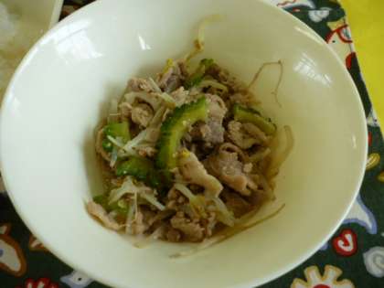 にがうり(ゴーヤ)と豚肉もやしをいため、塩、こい口しょうゆで味つけします。かつおぶしをかけて食べます。