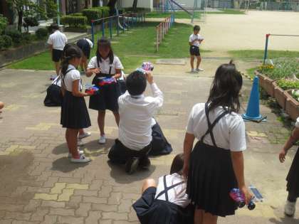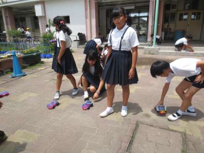 光を電気に変えて動かすソーラーカーです。個々に組み立てて実験をしています。7/11(月)