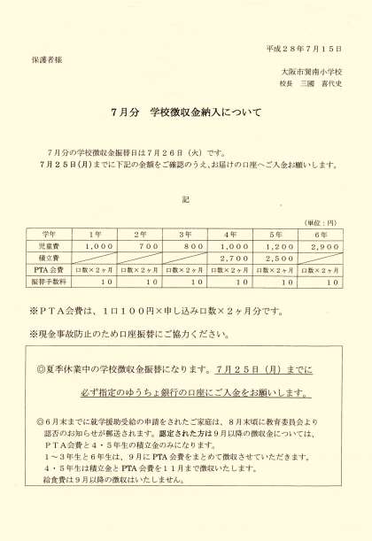 7月分の学校徴収金振替日は、7月26日(火)です。お届けの口座へ7月25日(月)までに、ご入金いただけますよう、よろしくお願いいたします。
