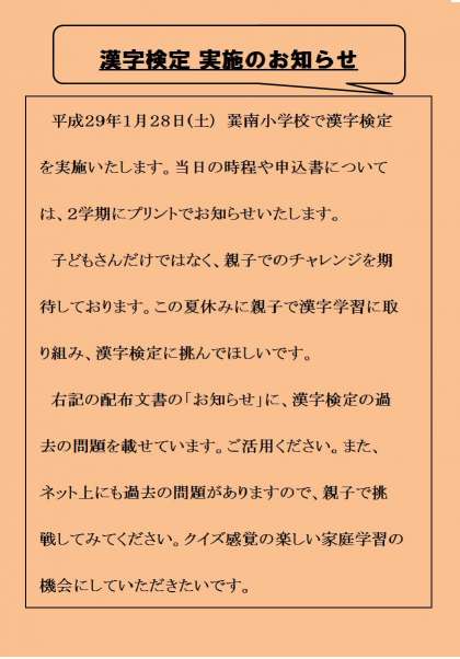 平成29年1月28日(土) 巽南小学校で漢字検定を実施いたします。当日の時程や申込書については、2学期にプリントでお知らせいたします。(会場設営等PTAにご協力をお願いしております)