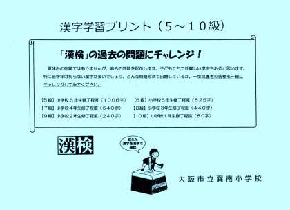 子どもさんだけではなく、親子でのチャレンジを期待しております。この夏休みに親子で漢字学習に取り組み、漢字検定に挑んでほしいです。右記の配布文書の「お知らせ」に、漢字検定の過去の問題を載せています。ご活用ください。また、ネット上にも過去の問題がありますので、親子で挑戦してみてください。クイズ感覚の楽しい家庭学習の機会にしていただきたいです。