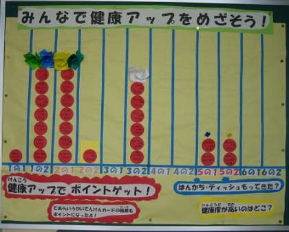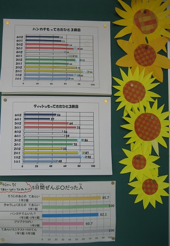 保健室前の掲示板には、健康チェックの結果を