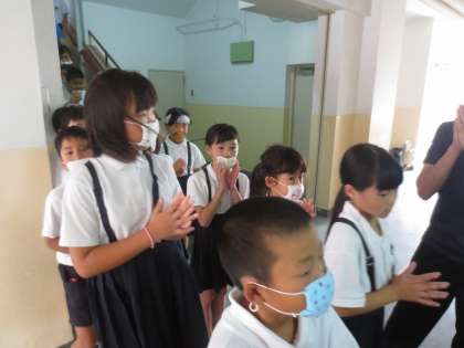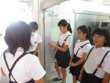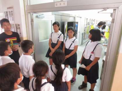 給食委員会の児童が献立内容と運搬の注意をしています。