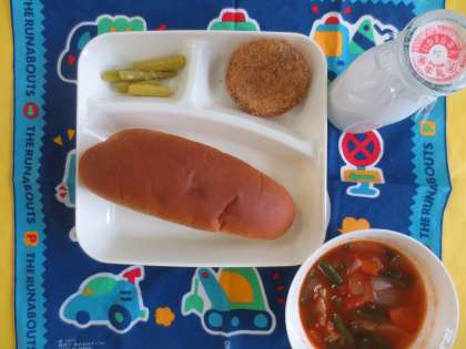 チキンレバーカツ、ケチャップ煮、グリーンサラダ、レーズンパン、牛乳