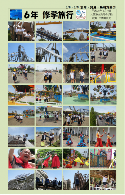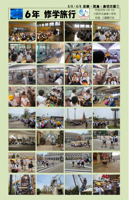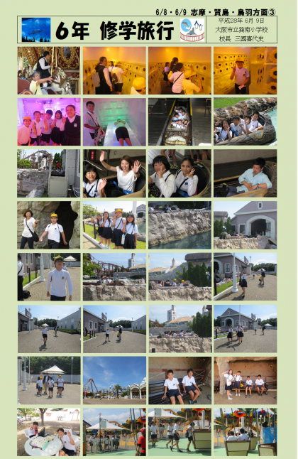 6年生の修学旅行6/8(木)・6/9(金)の様子を載せています。全ての場面は撮れていませんが、6年の児童が振り返るとみんなで過ごした楽しい場面が思いだされるはずです。ご覧ください。