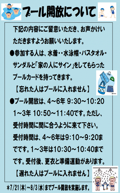 プール開放は、4〜6年 9:30〜10:20 1〜3年 10:50〜11:40です。