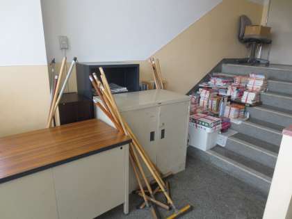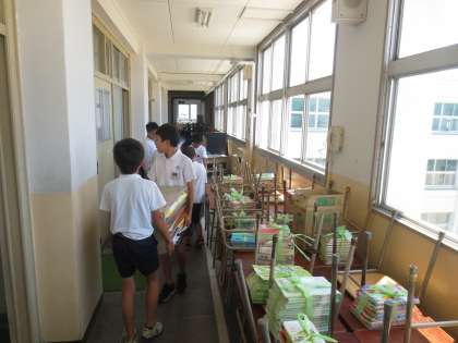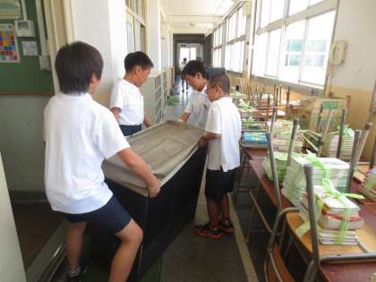 4階の教室及び多目的室などの特別教室の戸棚や荷物を廊下に移動させています。夏休み中に各部屋の床の改修工事をするためです。