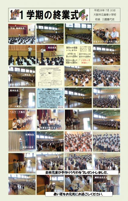 夏休み中の「学習」「遊び」「くらし・健康」「交通安全」や「プール開放」について、校長先生、上野先生、橋本先生からお話がありました。式の最後に松岡先生の指導で校歌を元気よく歌いました。