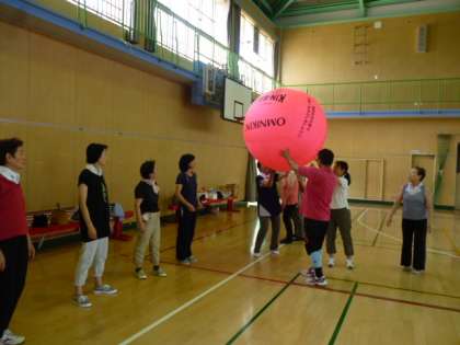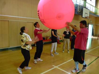 「キンボール」は、鮮やかなピンクの巨大ボール(直径1.2m、重さ1kg)を使用して、ボール遊びやスポーツ競技をします。