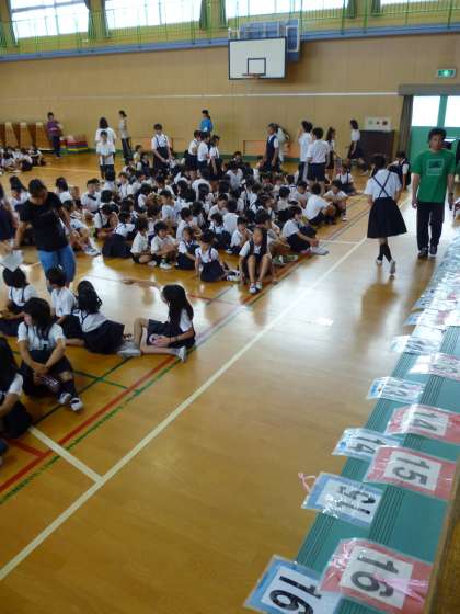 各学年を18班に分け、1年生から6年生まで、全学年で構成する18チームの「たて割り班」を編成しました。「異学年とのつながりを大切にしよう」と数年前から続けている取り組みです。もちろん最高学年の6年生が中心となり、メンバーをまとめ、また、低学年の手助けをすることも・・・。