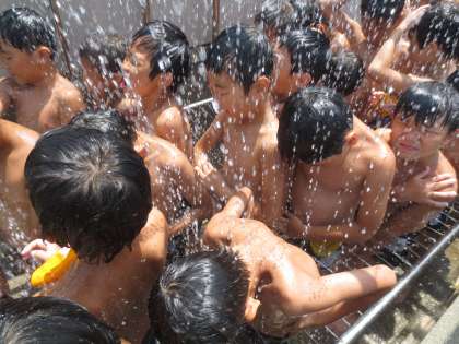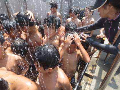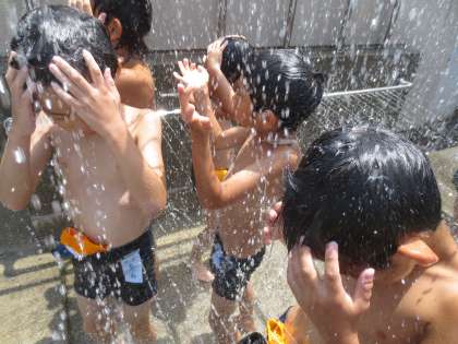 低学年のプール開放の様子です。水泳後のシャワーはいつも苦手なのか・・・泣きそうな顔になっています。