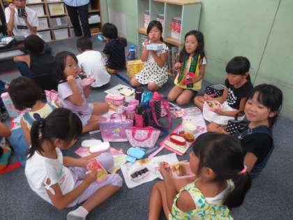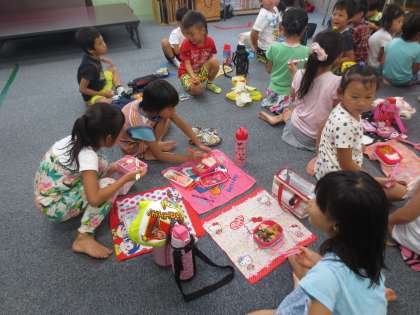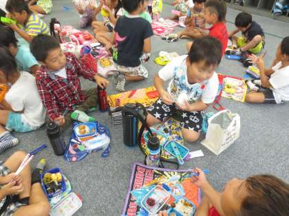 たくさんの子どもたちが、プール開放に参加した後のお弁当タイムです。とても美味しそうに食べていました。