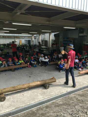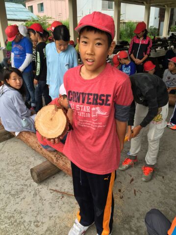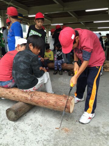みんなで力を合わせて倒した木を、3日目のコースターづくりの材料にするため、一人分ずつのこぎりで切りました。