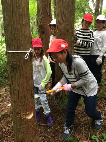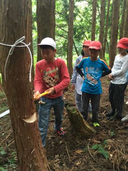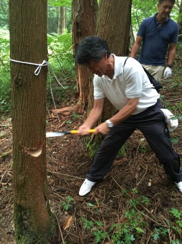 木の一方にうまく切り目ができました。次は、反対側を頑張って切りました。
