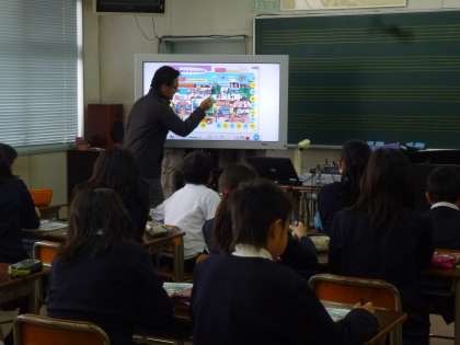 5年2組の英語活動は、音楽室にある電子黒板を使って行いました。映し出されたカラフルな絵を見ながら英語の発音を練習していました。