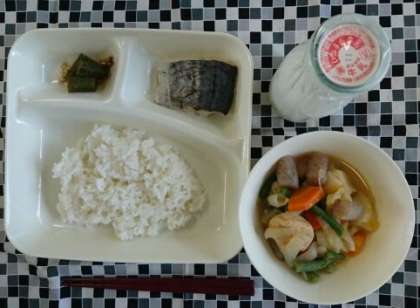 さごしの塩焼き、じゃがいもと一口がんもの煮もの、オクラのおかかいため、ご飯、牛乳