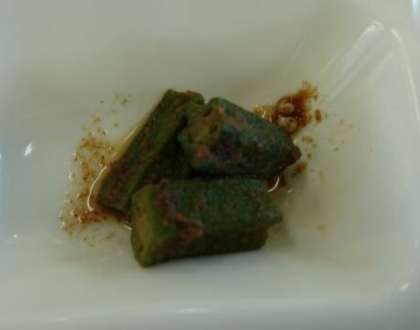 夏野菜のオクラをいためてかつおぶしとみりん、こい口しょうゆで味つけしています。