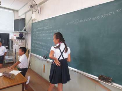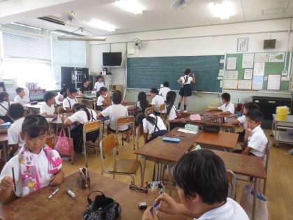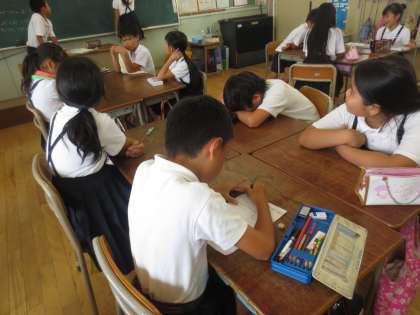 学級会の時間に運動会のテーマについて話し合っていました。一人一人が意見をだしグループでまとめていました。