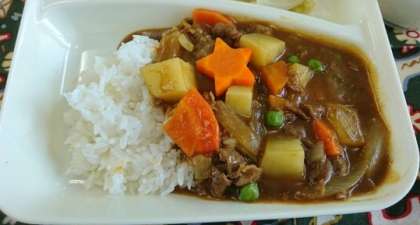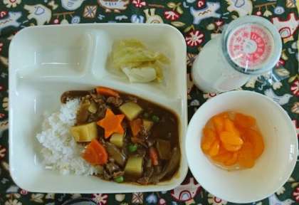 子どもに大人気のカレーライスです。9月は小麦アレルギーの児童も食べられる米粉のカレールウを使っています。