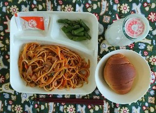 イタリアンスパゲッティ、グリーンアスパラガスのサラダ、黒糖パン小、牛乳