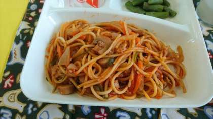 豚肉、ウインナーを主材にたまねぎ、にんじん、ピーマン、マッシュルームの入ったケチャップ味のスパゲッティです。