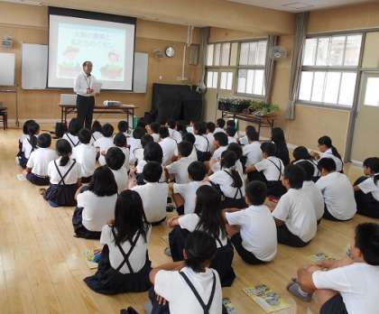 今日、5年生は、2時間目に「JA出前授業」を実施しました。初めに、昔の巽地域に住んでおられたJAの方から、50年前の私たちの住んでいる町の様子のお話がありました。今の大阪市で農業をしている人は少なくなってきていますが、「昔のスケッチ画集」より、巽南小学校付近の巽南2丁目も、昭和35年ごろは、田んぼばかりだったことがわかりました。田んぼに流れる用水路で、「ザリガニつり」もできたそうです。
