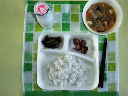 だいこん葉とはくさいの煮びたし、ご飯、牛乳