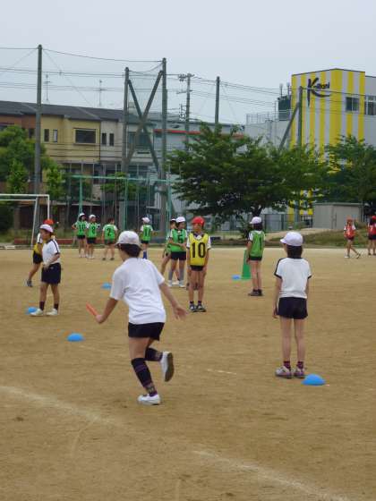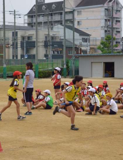 バトンの受け渡しの練習。コーナートップ。走る順番をどうするか。いろんな課題をみんなで解決しながら学習を進めています。
